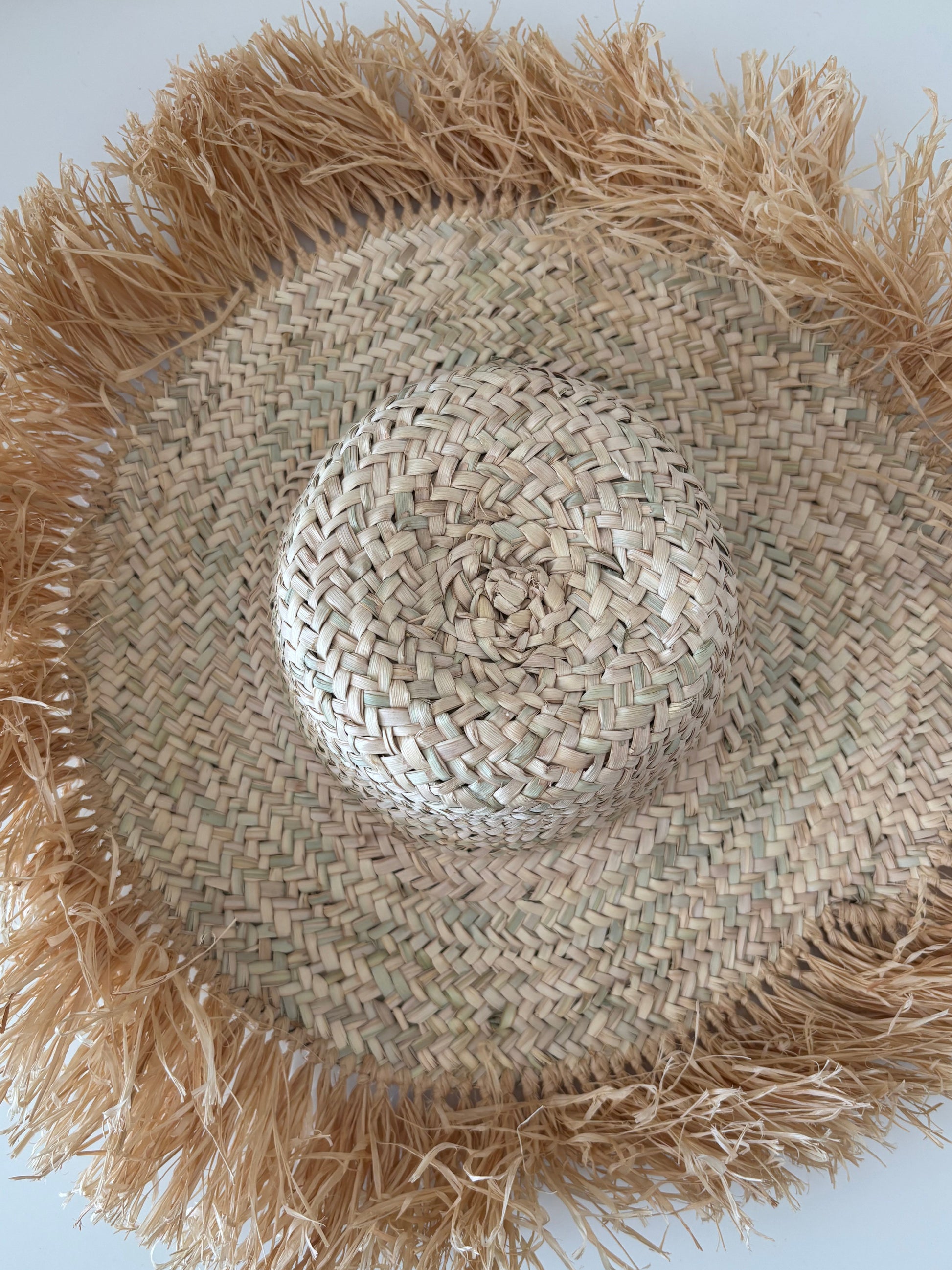 Élément décoratif mural artisanal en raphia, façonné avec précision à la main. Ce chapeau ornemental apporte une touche d'authenticité et de raffinement à votre intérieur.